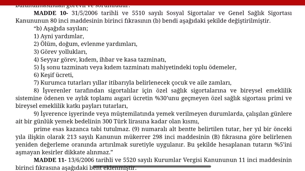 7577 Sayılı Kanun, Madde 10 | 17.04.2026 tarih, 33227 sayılı Resmî Gazete 5510 Sayılı Kanun Madde 80/1-b kapsamında yemek bedeli SGK prim istisnası günlük 300 TL olarak sabitlenmiştir. 16.04.2026 tarihine kadar (bu tarih dahil) eski tutar olan 158 TL geçerliyken, 17.04.2026 tarihinden itibaren yeni tutar olan 300 TL uygulanacaktır. Tutar her yıl yeniden değerleme oranında otomatik artırılacaktır.