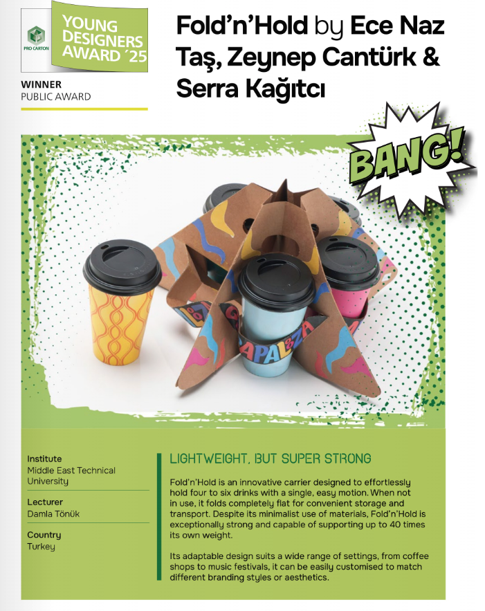 Üniversite öğrencileri ise Avrupa çapında dikkat çekti. Pro Carton Young Designers Award 2025’te ODTÜ Endüstriyel Tasarım Bölümü öğrencileri Avrupa Halk Oylaması Ödülü’nü kazandı. Pro Carton Student Video Award 2025’te ise aynı öğrenciler “Fold’n Hold” projesiyle Halk Oylaması Büyük Ödülü’nü alarak çifte başarı elde etti.
