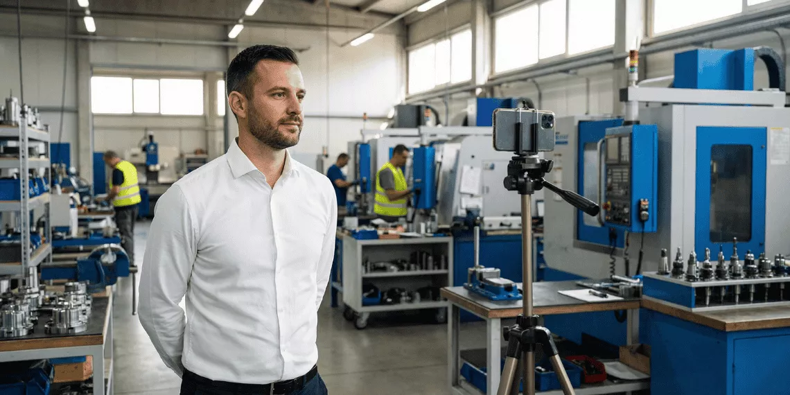 KOSGEB 2026 İş Geliştirme Desteği başvurusu için modern ve geniş bir imalathanede 10 dakikalık tanıtım videosu çeken beyaz gömlekli Türk girişimci.