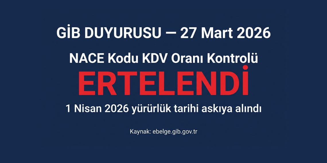 GİB duyurusu 27 Mart 2026 — NACE kodu KDV oran kontrolü ertelendi, 1 Nisan yürürlük tarihi askıya alındı