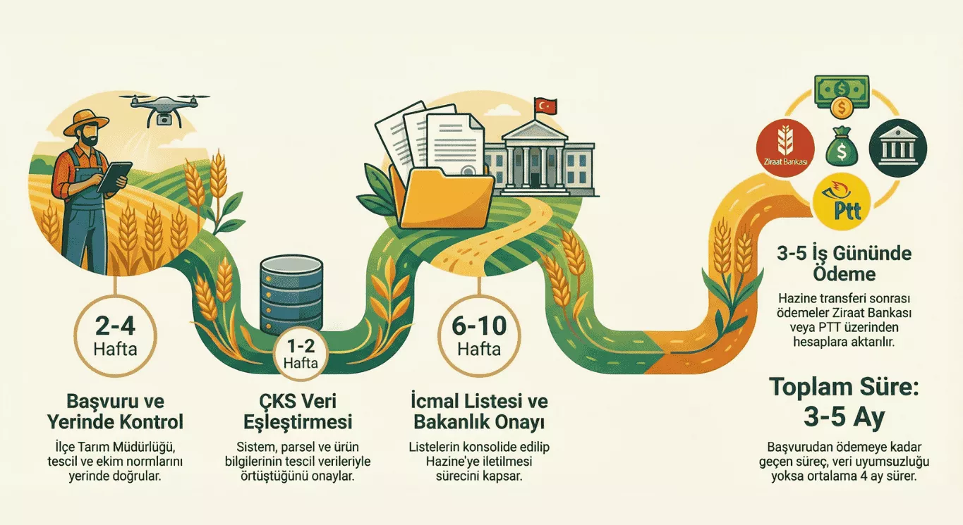 Tüm aşamaların sorunsuz ilerlediği bir yılda bu süreç başvurudan ödemeye ortalama 3–5 ay sürmektedir. Yoğun başvuru dönemlerinde veya ÇKS veri uyumsuzluklarında bu süre uzayabilir.