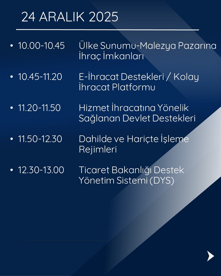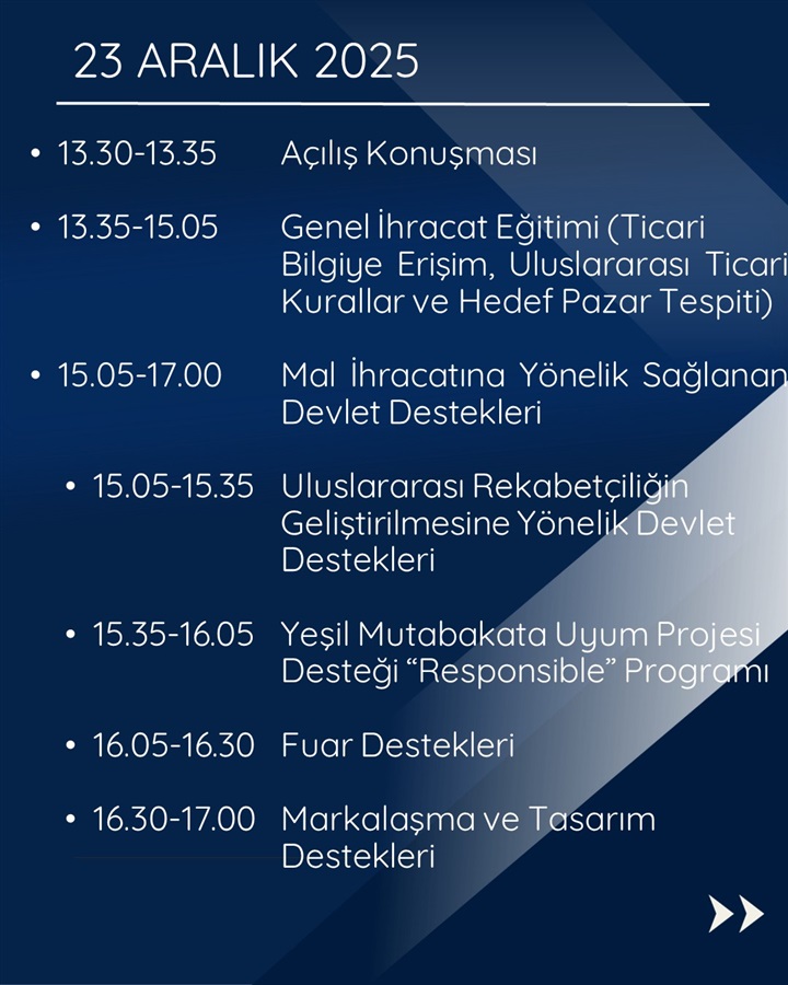 İşletmesini küresel pazarlara açmak isteyen KOBİ’ler için yılın son ve en büyük fırsatı kapıda. Ticaret Bakanlığı İhracat Süreçleri ve Devlet Destekleri Eğitim Programı, 2026 yılına girmeden önce dış ticaretin tüm inceliklerini öğrenmek isteyen girişimciler için 23-24-25 Aralık tarihlerinde online ve sertifikalı olarak gerçekleştirilecek.